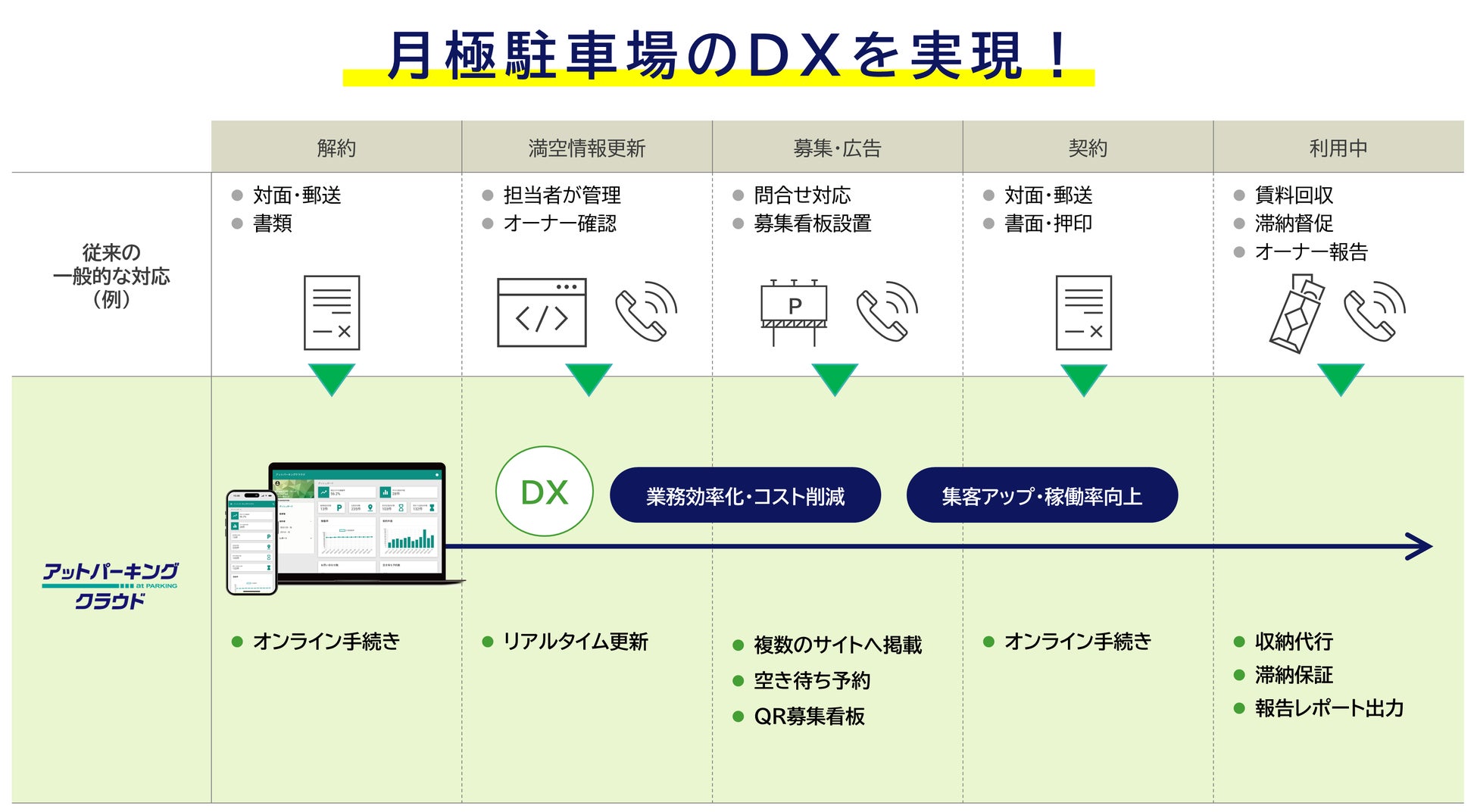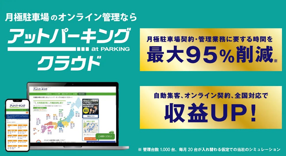 「アットパーキングクラウド」は、月極駐車場の管理業務を最大95%(※)削減し、高い集客力で稼働率を向上させる不動産会社向けの月極駐車場オンライン管理支援サービスです。