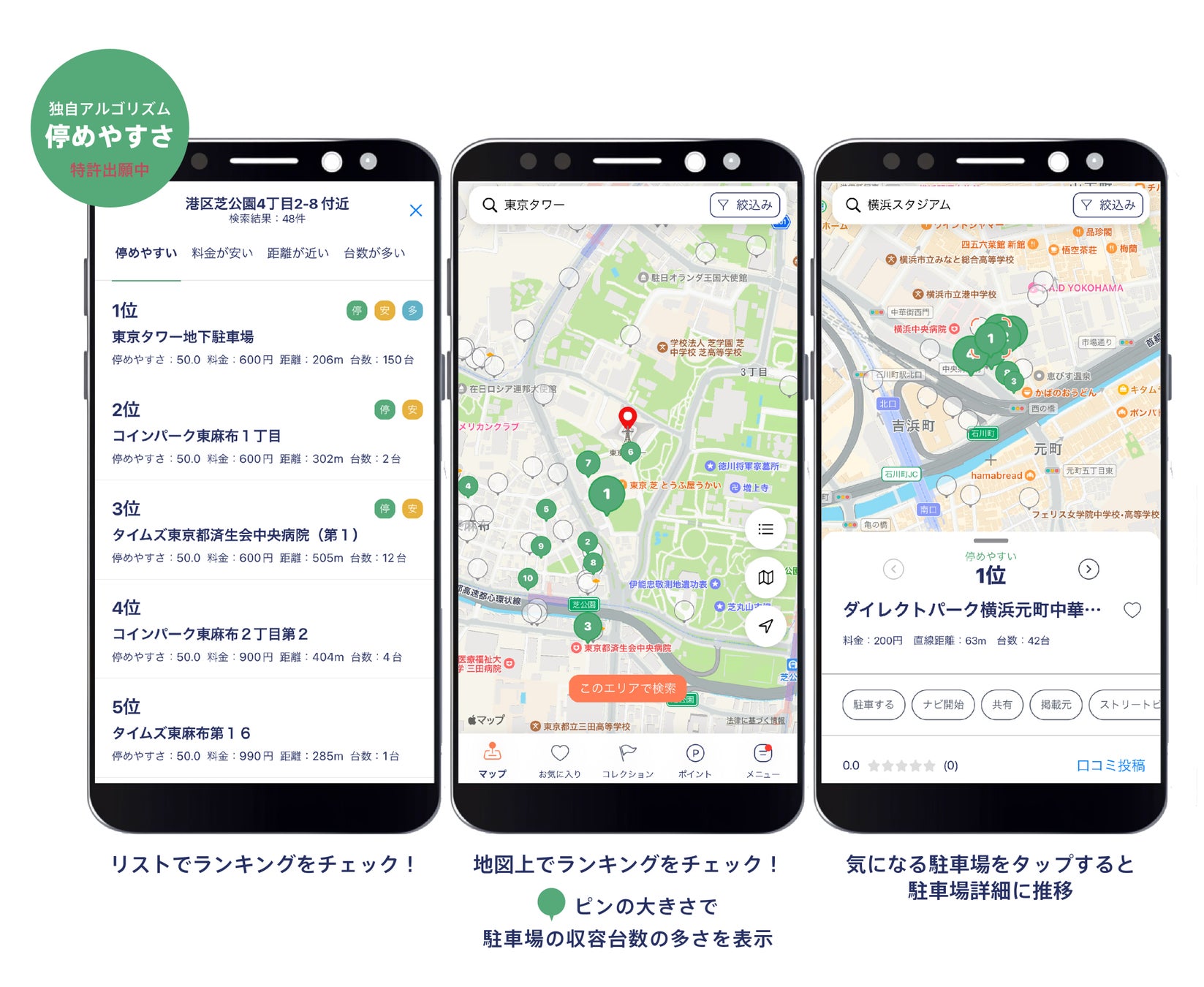 車でのおでかけ・旅行、ドライブデートにおすすめ【無料】ポイ活機能付きの駐車場検索アプリです。「現在地周辺」もしくは「場所または住所」で検索し、希望条件にあった最適な駐車場をマップ上でランキング表示。「停めやすい」「料金が安い」「距離が近い」「台数が多い」順など優先したい内容がアイコンで表示され、さらにタブ切り替えでスムーズにリスト一覧表示でき、簡単に希望通りの駐車場を全国約13万ヶ所(2024年2月現在)から検索します。