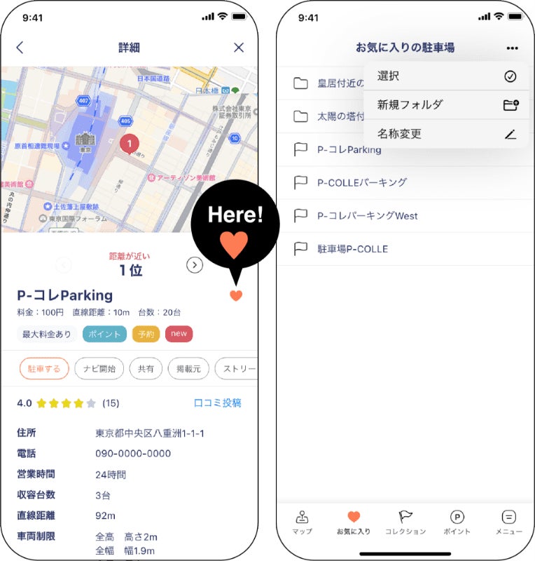 業界唯一の特許出願中機能「停めやすさ機能」を搭載。恋人との特別なドライブデートも、駐車場探しのストレスなく安心して楽しめます。運転が苦手な人でも簡単に停められる駐車場を提案するので、二人の時間に余裕が生まれます。さらに、気に入った駐車場をお気に入りに登録しておくと、次回のデート計画がスムーズに進められます。